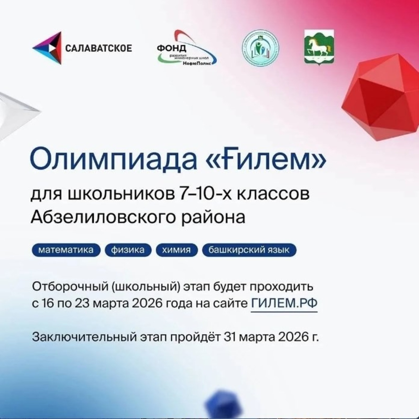 Ҡатнашыусыларҙы теркәү 16 марттан башланды һәм беренсе тур башланғанға тиклем дауам итәсәк. 2025 йылда олимпиада бөтә райондан 1600-ҙән ашыу уҡыусыны йыйҙы. Финалға, ул Таһир Кусимов исемендәге гимназия базаһында үтә, 315 кеше сыҡты. Ҡатнашыусылар физика, математика, химия һәм башҡорт теле буйынса белемдәрен күрһәтте. Башҡорт телен дисциплиналар исемлегенә индереү күптәр өсөн көтөлмәгән хәл һәм туған телде уҡытыуҙың мөһимлеген таныу билдәһе булды. Ул саҡта район уҡытыусылары «Ғилем» традицион конкурс булыр тигән өмөт белдерә. «Салауат» яуаплылығы сикләнгән йәмғиәтенең компания-спонсоры етәкселегендә: теүәл фәндәргә ҡыҙыҡһыныу — ул абруй мәсьәләһе генә түгел, ә производство кәрәклеге. - Белем-ул иң мөһим капитал. Бөгөн илгә геологтар, инженерҙар һәм IT-белгестәр кәрәк, — тип белдерҙе предприятие директоры Таһир Бәхтегәрәев. Ҡатнашыуға 7-10 класс уҡыусылары саҡырыла. Беренсе этап дистанцион форматта үтәсәк. Заданиелар 18 марттан 23-нә тиклем олимпиаданың рәсми сайтында урынлаштырыласаҡ. Икенсе, күҙгә-күҙ ҡарашып тур 31 мартта үтәсәк. Унда еңеүселәрҙең исемдәре билдәләнәсәк. Теләгән һәр кем теркәлеүҙе ҡаршылыҡһыҙ үтә ала. Теркәлеү өсөн һылтанма: vk.cc/cVoY7S Олимпиаданың рәсми сайты: xn--c1aeimg.xn--p1ai/